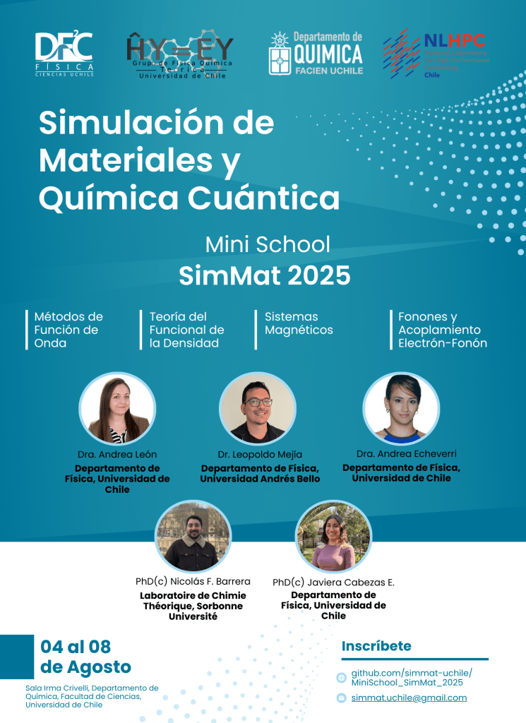 From August 4 – 8, 2025, the Mini-School SimMat 2025 took place at the Juan Gómez Millas campus of the University of Chile. The event was organized by our research group and focused on introducing students and early-career researchers to modern computational materials science. It combined theoretical lectures with hands-on sessions on first-principles simulations, data analysis, and high-throughput materials discovery using open-source tools. All teaching materials and exercises are freely available on the SimMat GitHub repository.